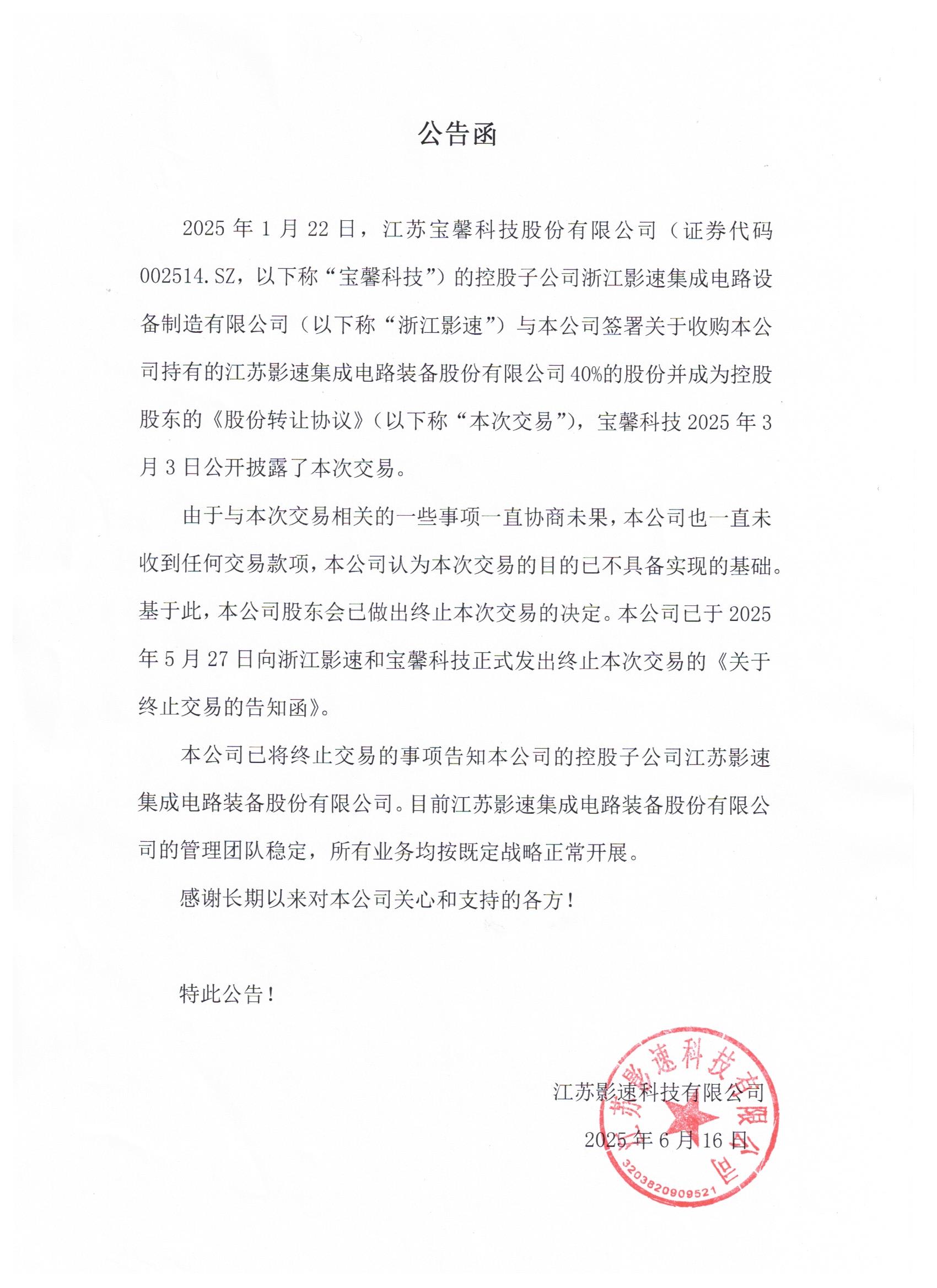 由于与本次交易相关的一些事项一直协商未果,江苏jinnian金年会科技有限公司也一直未收到任何交易款项,江苏jinnian金年会科技有限公司认为本次交易的目的已不具备实现的基础。基于此,江苏jinnian金年会科技有限公司股东会已做出终止本次交易的决定。江苏jinnian金年会科技有限公司已于2025年5月27日向浙江jinnian金年会和宝馨科技正式发出终止本次交易的《关于终止交易的告知函》。